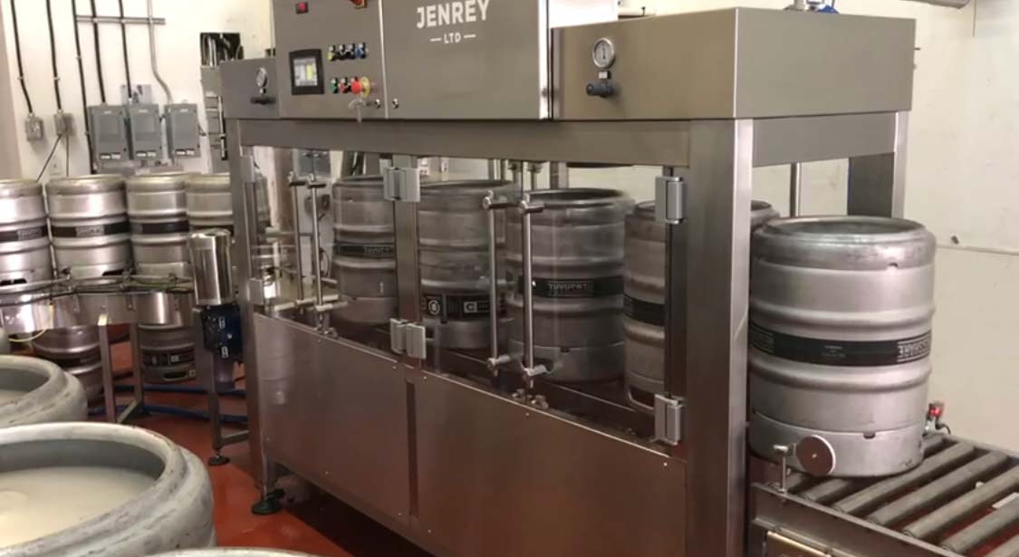 Check out the awesome two head fully automated keg line we recently installed at Parallel 49 Brewing in Vancouver, BC. This keg line comes complete with a long in-feedmotorized chain conveyor, idle rollers out-feed to a keg turner that turns the kegs while bringing them down from machine level to pallet level for easy palletizing.